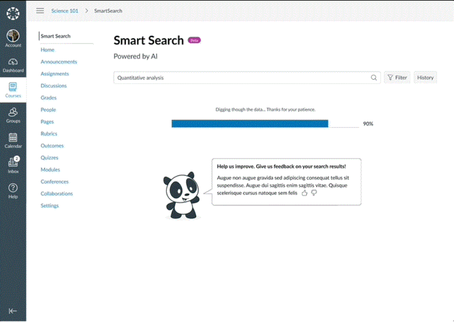 Finding the content you're looking for in Canvas can be challenging – especially if you don't remember the exact keywords or phrases in the content you're trying to find. That's where Smart Search comes in – it taps into AI's ability to understand query context, thus providing more accurate and relevant search results. This feature facilitates faster content discovery for both teachers and students by finding content from course pages, discussion prompts, and assignments.