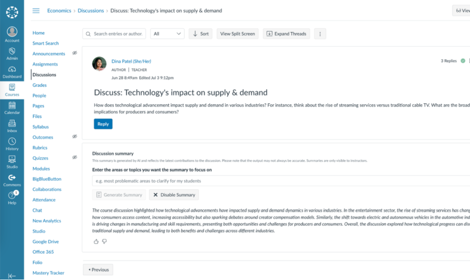 Discussion Summaries is an AI-powered Canvas feature to help educators quickly distill complex online discussion threads into concise, actionable insights. It allows educators to identify central themes, key questions, and emerging trends with just a single click, freeing them from the time-consuming process of sifting through hundreds of comments and allowing them to focus on fostering meaningful dialogue and guiding student learning, particularly in large-scale courses.